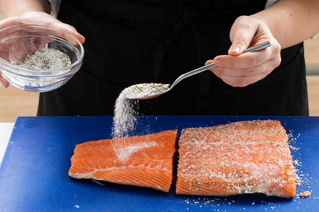 Посыпьте немного смеси на дно емкости для засаливания. Положите сверху один кусок рыбы, кожей вниз.