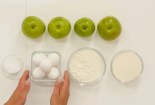 Приготовить все ингредиенты. На 1 кг яблок вам потребуется 5 яиц, 1 стакан (250 мл) сахара и столько же муки, а также 1 чайная ложка разрыхлителя. Весы не понадобятся: вполне можно справиться с простым рецептом шарлотки с яблоками и без них.