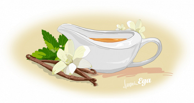 Это не совсем соус, но зато прекрасное ароматное дополнение к блинчикам, к кофейным пирожным, к выпечке, а также к кофейным напиткам. Возьмите 3 стручка ванили, 200 г сахара и 150 мл воды. Из ванили выньте семена. Воду с сахаром доведите до кипения, добавьте семена, проварите минут пять, помешивая. Когда сироп остынет, получится что-то вроде очень жидкого меда. Хранить его в холодильнике можно около двух недель.