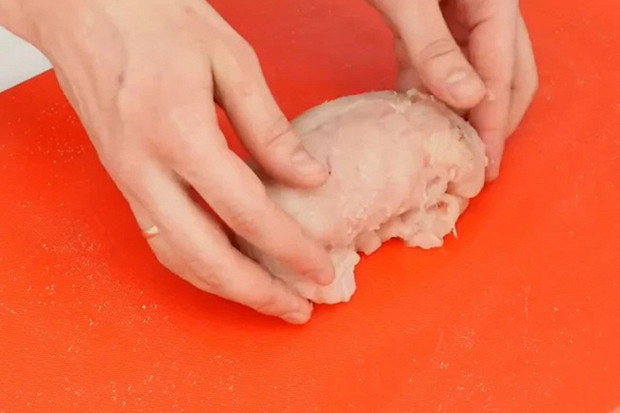 Куриное филе выложите не доску и сделайте глубокий надрез вдоль посередине, ведя нож параллельно доске. Ни в коем случае не дорезайте до конца! Затем раскройте филе как книгу.