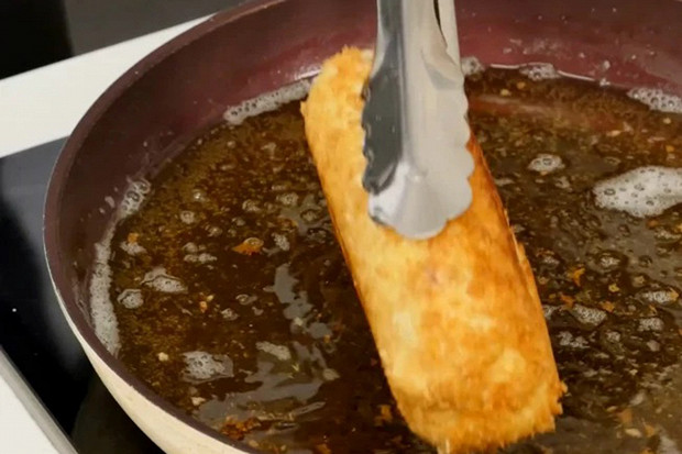 В глубокой сковороде разогрейте растительное масло. Отмеряйте масло так, чтобы рулетики можно было погрузить в него наполовину. Обжарьте рулетики во фритюре сначала с одной стороны до золотистой корочки, потом с другой.