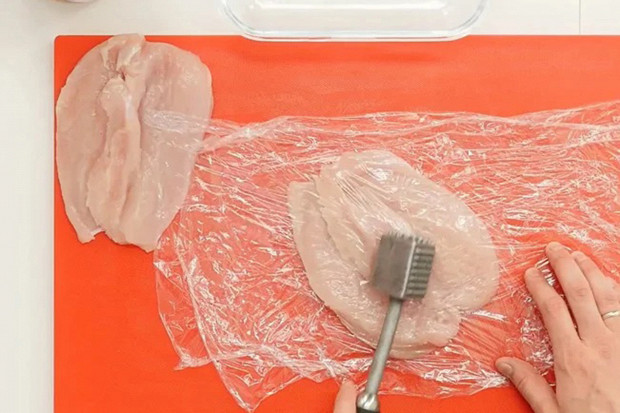 Накройте филе пищевой пленкой и отбейте пока толщина не дойдет до 5 мм.