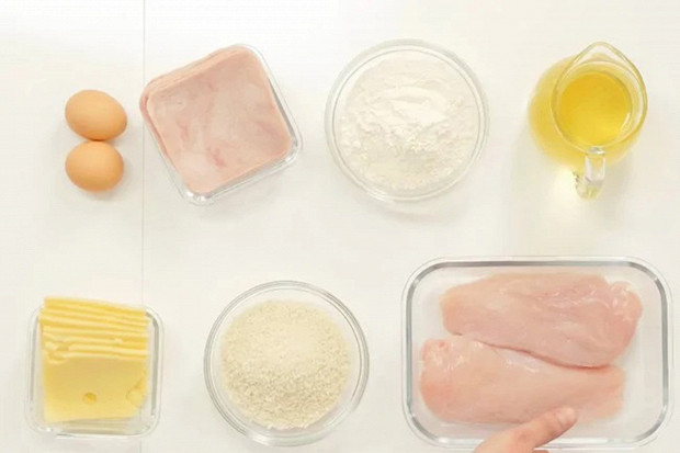 Подготовьте ингредиенты. На 2 порции вам понадобится 2 куриных филе, 70 г ветчины, столько же швейцарского сыра, 500 мл растительного масла, 1 яйцо, 100 грамм муки и 10 грамм панировочных сухарей.