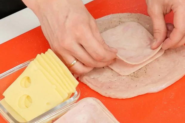 Выложите в центр каждого филе 2-3 ломтика ветчины и 2-3 ломтика сыра.