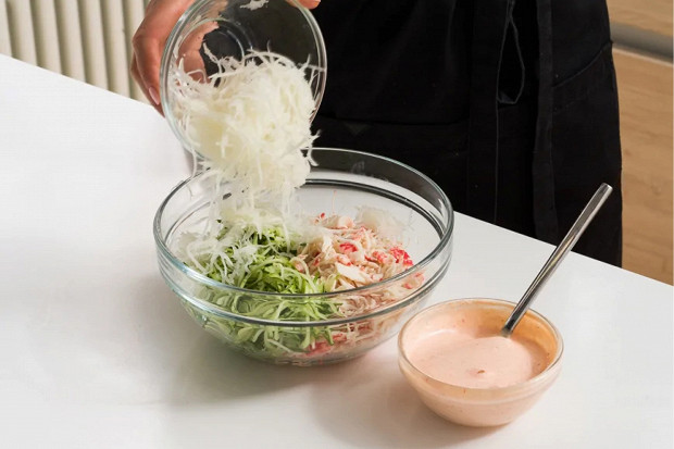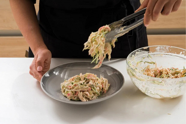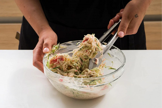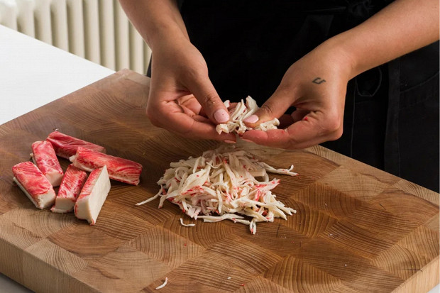 Крабовые палочки порвите на волокна. Во-первых, это усилит иллюзию крабового мяса, а во-вторых, такая текстурность придаст салату вес и новые вкусовые ощущения.