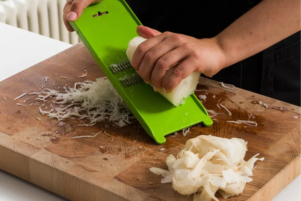 Так же натрите дайкон. Только убедитесь заранее в том, что вам достался крепкий и не увядший корнеплод, полный сока.
