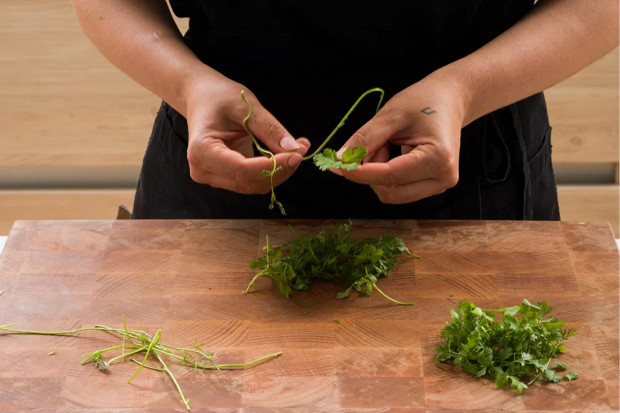 У кинзы оторвите листья со стеблей. Стебли выкидывать не надо — их можно отправить в бульон или заморозить и также отправить в бульон или всевозможные рагу, но чуть позже.