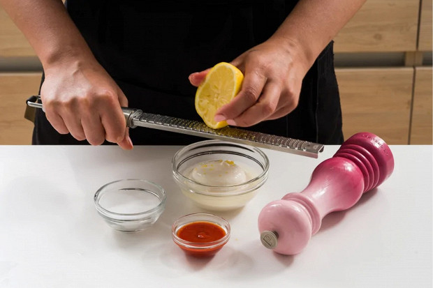 Майонез смешайте с соком и цедрой половины лимона, добавьте шрирачу, соль и перец. Майонез может быть домашним (на нашем сайте немало интересных рецептов), а лимон может быть не простым, а узбекским — тем, что чуть пахнет елочкой.