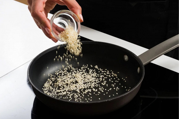 Подготовьте все ингредиенты: 200 г крабовых палочек, по 200 г огурцов и дайкона, 70 г майонеза, одна столовая ложка шрирачи, половинка лимона, три веточки кинзы, одна столовая ложка кунжутных семечек, соль с перцем, взятые по вкусу. Начните готовку с обжарки кунжута: отправьте его на сухую сковороду и слегка обжарьте, пока он не приобретет золотистый оттенок.