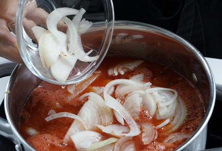 Нарежьте 3 головки репчатого лука полукольцами. Добавьте их в кастрюлю.