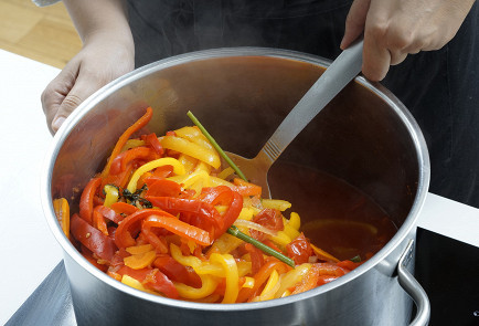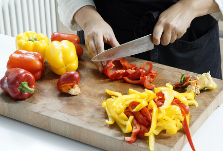Лечо в первую очередь должно состоять из перцев. Возьмите 5 килограмм сладкого перца. Разрежьте каждый, удалите зерна и перепонки, нарежьте на ломтики. Добавьте перец в кастрюлю.