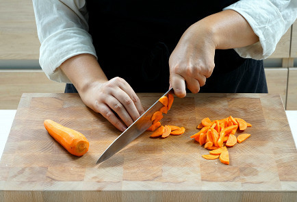 Нарежьте 3 средние моркови ломтиками, добавьте в кастрюлю.