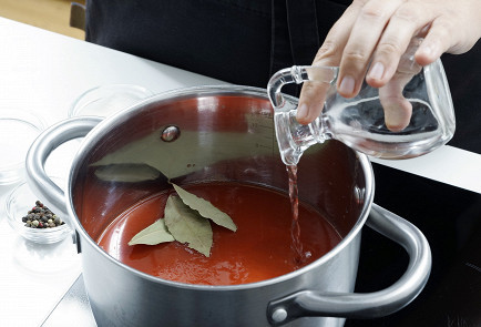 Добавьте 50 мл 9%-ного уксуса, по 0,5 столовой ложки сахара, соли и смеси перцев, 3 лавровых листа. Поставьте все на средний огонь. Основа для лечо готова.