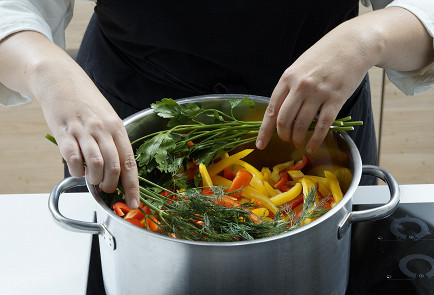 Добавьте любимую зелень — петрушку, укроп, кинзу или другую, пучками. Перемешайте.