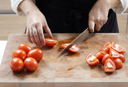 Пока сок греется, нарежьте 1,5 килограмма помидоров, небольшие — на две части, крупные — на четыре. Добавьте их в кастрюлю.