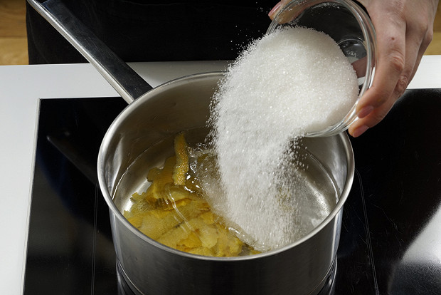 В сотейнике смешайте 1 литр воды, сахар, цедру и сок половины лимона, доведите смесь до кипения и растворения сахара.