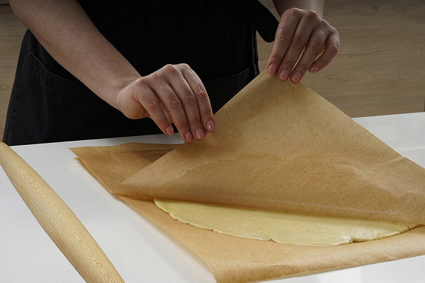 Достаньте тесто из холодильника, раскатайте между двумя листами бумаги для выпечки до толщины 5 мм.