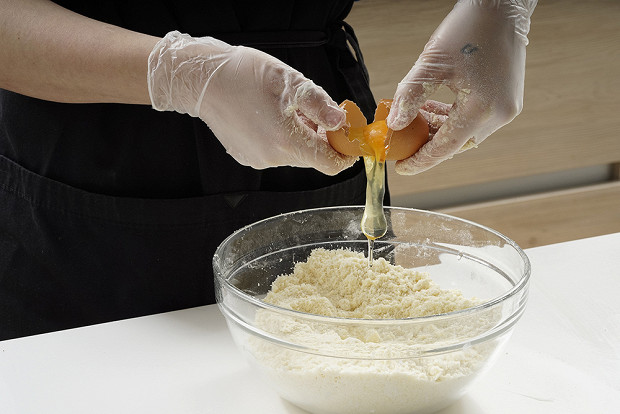 Добавьте к тесту яйцо. Перемешивайте тесто, пока оно не начнет слипаться.