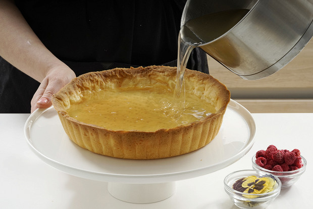 Залейте смесью остывший тарт, украсьте цветами, ягодами или пищевыми блестками. Уберите в холодильник до полного застывания. На это потребуется примерно час.