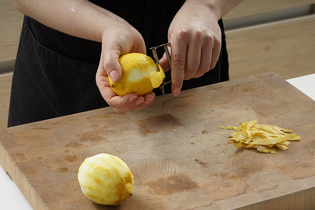 Самое время приступить к главному — наполнению. Для начала снимите цедру с обоих лимонов, не задевая белой части.
