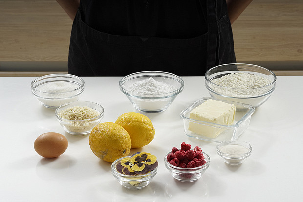 Подготовьте ингредиенты: 230 грамм пшеничной и 50 грамм миндальной муки, 95 грамм сахарной пудры, 150 грамм сливочного масла, 1 яйцо, 2 лимона, 130 грамм сахара, 10 грамм агар-агара, соль, а также украшение: мы взяли цветы фиалок, жасмина, анютины глазок и сублимированную малину (у нее яркий и красивый цвет). За час до начала уберите сливочное масло в морозильник.