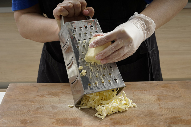 Ледяное сливочное масло натрите на терке. Быстро вмешайте сливочное масло в тесто, пока оно не успело растаять. Можно сделать это руками, сжимая масло с мукой в ладонях и перетирая между пальцами. В итоге структура теста должна напоминать песок.