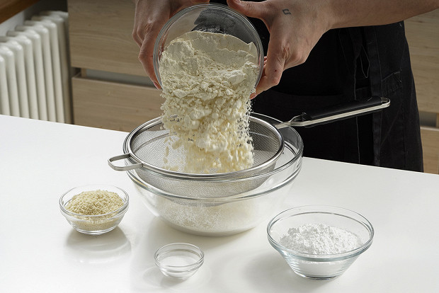 Приготовьте корж. Для этого просейте пшеничную муку и сахарную пудру. Добавьте к смеси миндальную муку и щепотку соли.