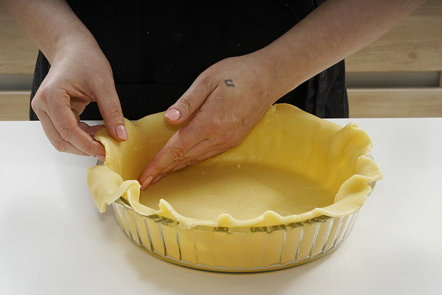 Переложите тесто в форму, срежьте излишки теста с помощью скалки. Мы взяли стеклянную форму диаметром 24 см. Идеально подойдет для наших целей разъемная форма или любая с высокими бортами. Уберите форму c тестом в холодильник на 15 минут.