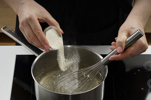 Процедите лимонный сироп, вмешайте агар-агар. Помешивая венчиком смесь, доведите все до кипения. Агар-агар должен полностью раствориться. Если в смеси образовались комочки, процедите ее через сито. Отставьте сотейник на 15 минут. Смесь должна слегка остыть. Если на ее поверхности начала образовываться пленка, прогрейте все еще раз, а затем слегка остудите.