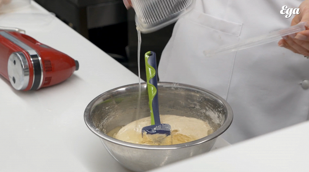 Соедините сухую смесь с яйцами и сахаром. Делайте это в три-четыре этапа, всыпая по чуть-чуть и постоянно помешивая лопаткой. Мешайте до тех пор, пока масса не станет однородной. Есть правило добавления сухих ингредиентов в яйца: лопатку надо вращать по часовой стрелке, а миску — против. Это позволяет быстро соединить ингредиенты и, таким образом, не выпустить из теста весь кислород, который нужен кексу для пышности. Не стоит смешивать ингредиенты миксером — он так же, как и длительная работа с тестом, выведет наружу весь кислород. Вам нужны всего лишь лопатка и рука.