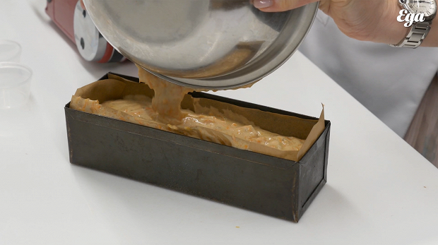 Возьмите форму размером 24x8 см. Смажьте ее любым растительным маслом. Выложите форму пергаментом. Тесто должно занять три четверти формы. Когда кекс испечется, он будет слегка вылезать из формы.