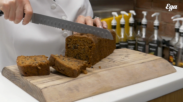 Готовый кекс нарежьте на кусочки толщиной пару сантиметров — не тоньше, иначе он развалится.