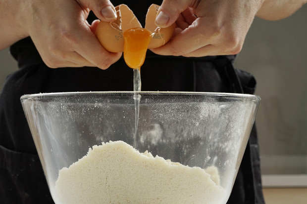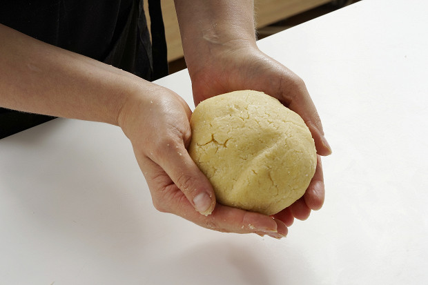 Добавьте в смесь 1 яйцо (оно тоже должно быть из холодильника) и вымесите тесто до однородной консистенции. Действуйте быстро: тесто не должно нагреться и начать прилипать к рукам. Если все-таки тесто прилипает — добавьте еще немного муки. Чем холоднее тесто, тем более рассыпчатым получится корж.