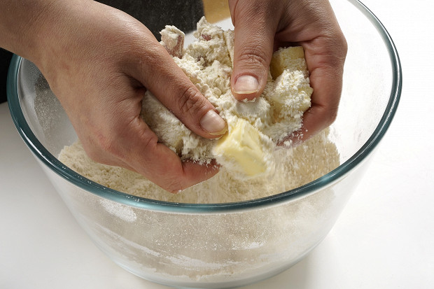 Масло (которое должно быть из холодильника) нарежьте небольшими кубиками и добавьте муку. Перетрите руками или порубите масло с мукой в крошку. Делайте это как можно быстрее, чтобы масло не успело нагреться и растаять.
