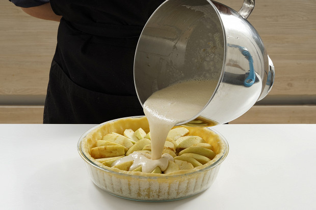 Залейте крем в форму с яблоками.