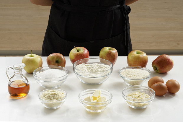 Подготовьте все ингредиенты. Пирог состоит из трех частей: тонкий корж, яблоки и заливка, которая придает пирогу сочность и деликатность. Всего вам понадобится по 200 грамм сахара и муки, 120 грамм сливочного масла, 3 яйца, 700 грамм яблок, 200 грамм сметаны (или жирных сливок) и 50 грамм миндальной муки. Для отдушки используется 100 мл кальвадоса или коньяка. Чтобы пирог не пригорал, форму нужно посыпать панировочными сухарями, а сам пирог — миндальными лепестками.