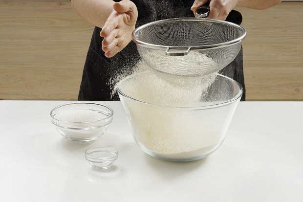 Пшеничную и миндальную муку просейте через мелкое сито. Добавьте в смесь муки 100 грамм сахара и щепотку соли.
