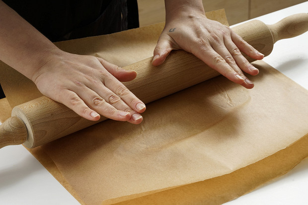 Достаньте тесто и скалку из холодильника и раскатайте тесто в пласт чуть большего диаметра, чем форма (форму берите 26 см). Чтобы тесто не прилипало, удобнее всего его раскатывать между двумя листами пергамента.