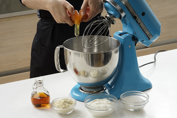 Приготовьте кремовую заливку. Для этого взбейте миксером добела 100 грамм сахара и 2 яйца, добавьте миндальную муку, сметану и кальвадос, перемешайте ложкой до однородного состояния.