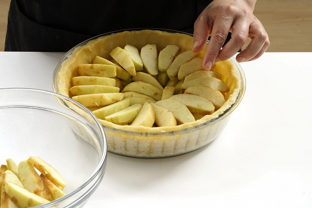 По кругу на тесто уложите яблоки, слегка внахлест.