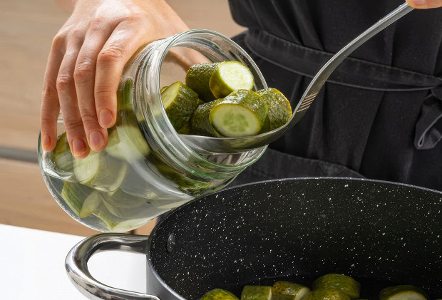 Выложите огурцы в горячий маринад и, постоянно помешивая, дождитесь, пока они не изменят цвет.