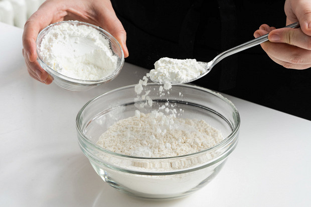 В отдельной миске смешайте 2 стакана муки и 2 столовых ложки крахмала.