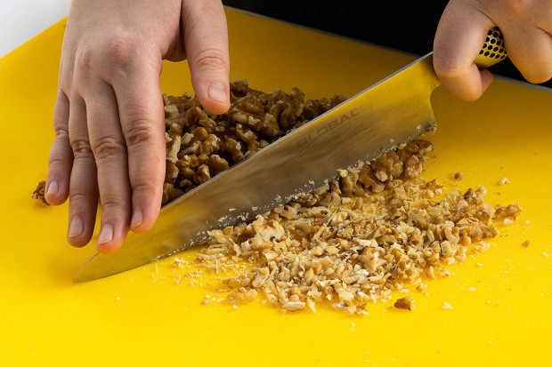 Порубите 2 стакана грецких орехов ножом не слишком мелко. Отложите.