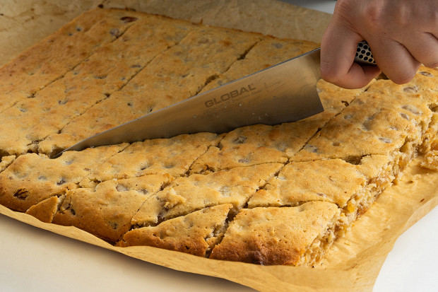 Дайте «Мазурке» немного остыть и нарежьте на ромбы. Для этого сначала нарежьте ее на полосы, параллельные узкому краю, а затем — по диагонали.