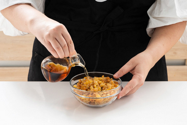 Промойте 1,5 стакана изюма, замочите в 3 столовых ложках коньяка. Лучше брать более-менее плоскую тарелку, чтобы изюм был полностью покрыт коньяком, или можете добавить немного воды; главное, чтобы все сухофрукты были в жидкости. Оставьте на час.