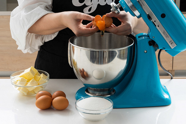 Разбейте в дежу миксера 6 куриных яиц, всыпьте 1,5 стакана сахара и добавьте 280 грамм размягченного сливочного масла. Взбивайте на средней скорости в течение 5 минут, пока все ингредиенты не соединятся в однородную массу.