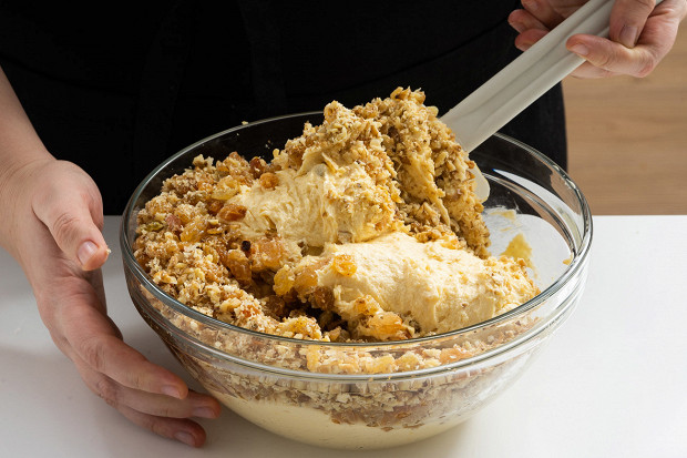 Слейте коньяк (или смесь воды и коньяка), лопаткой вмешайте изюм и орехи в тесто.