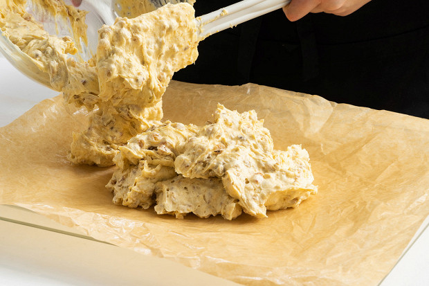 Застелите противень пергаментом для выпечки, возьмите 20 грамм размягченного сливочного масла, натрите им пергамент. Выложите на пергамент тесто, разровняйте его лопаткой так, чтобы оно ровным и тонким слоем покрывало весь противень.