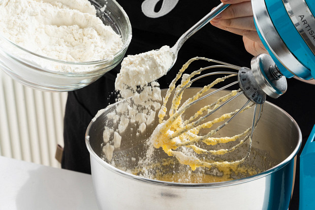 Добавьте сухую смесь в дежу миксера, взбивайте, пока масса не станет однородной.