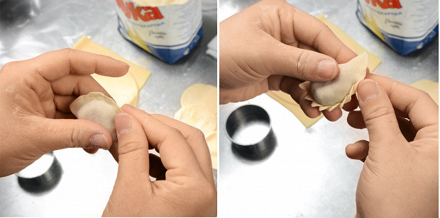 После того как будет замешено тесто, надо раскатать его в пласт толщиной 2 мм — вручную или с помощью машинки для пасты. Затем кулинарным кольцом или другим подходящим предметом вырезать из него кружки диаметром 6–7 см.